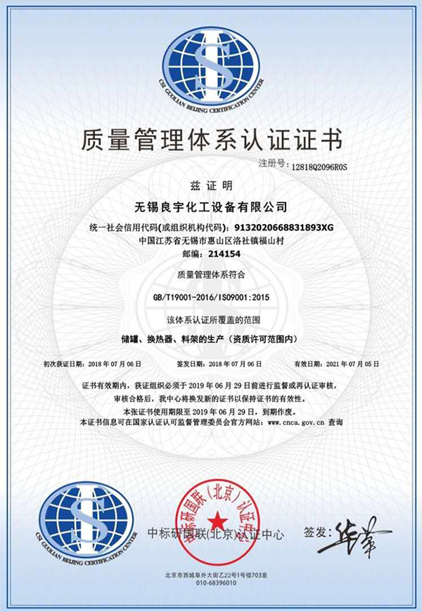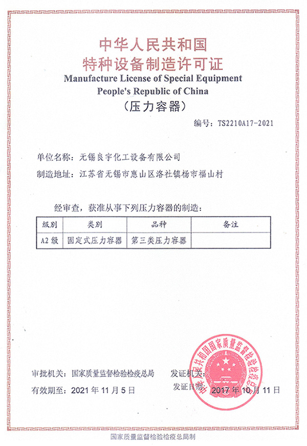 我們?nèi)〉脡毫θ萜髦圃煸S可證單位,具備A2級(jí)(I、II、III)碳鋼、不銹鋼壓力容器制造資質(zhì),并通過(guò)ISO9001質(zhì)量體系認(rèn)證。